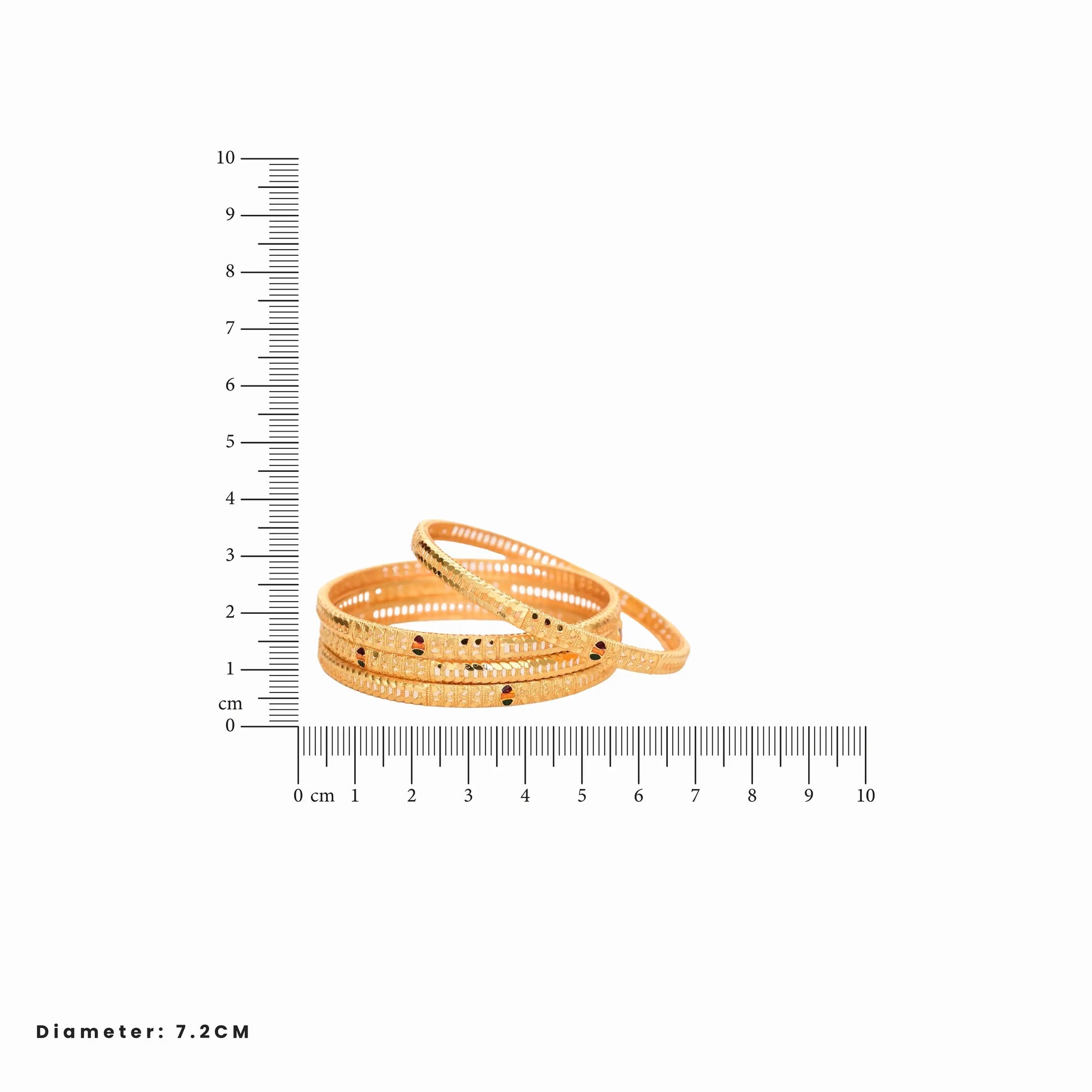 Add timeless elegance to your collection with the graceful charm of Anvika Gold Bangles. Designed with intricate cutwork patterns and delicate red-green enamel accents, this 4-piece set reflects refined traditional craftsmanship with a radiant gold-plated finish.