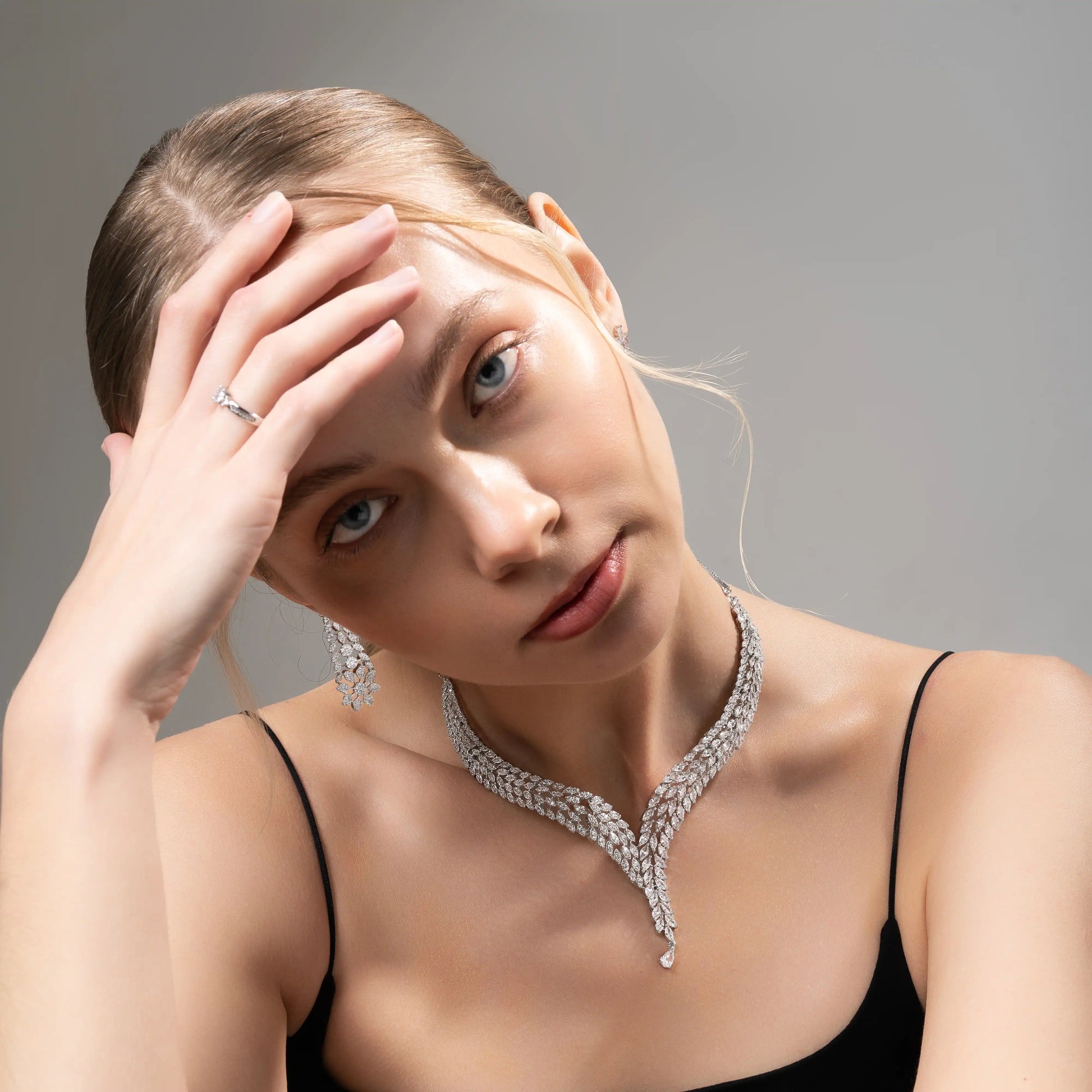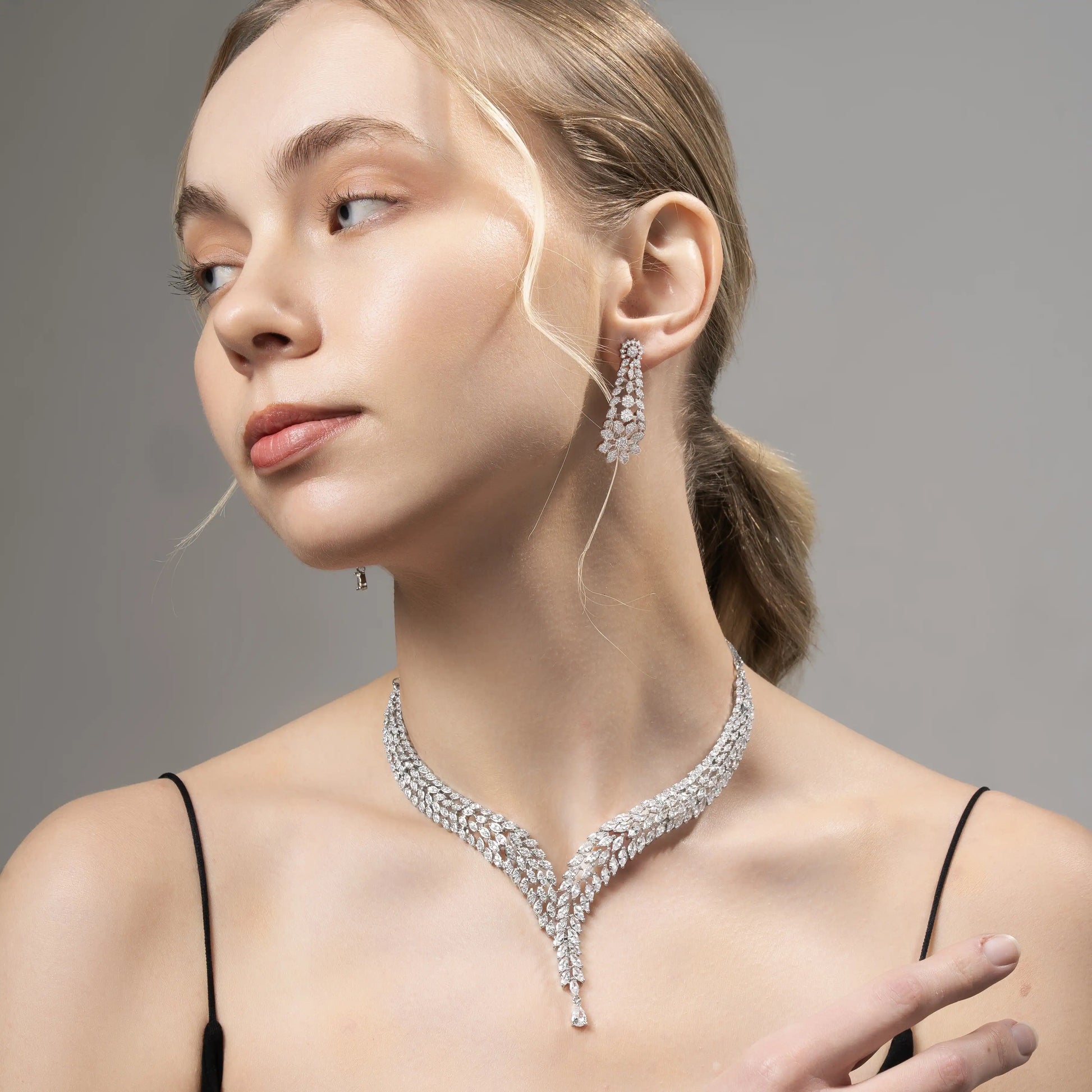 Elevate your style with the Velora V Cascade, a stunning necklace set designed with sparkling American Diamonds in a graceful V-shaped cascading pattern. The elegant drop at the center adds a refined touch, creating a luxurious and sophisticated look perfect for weddings, parties, and special occasions.